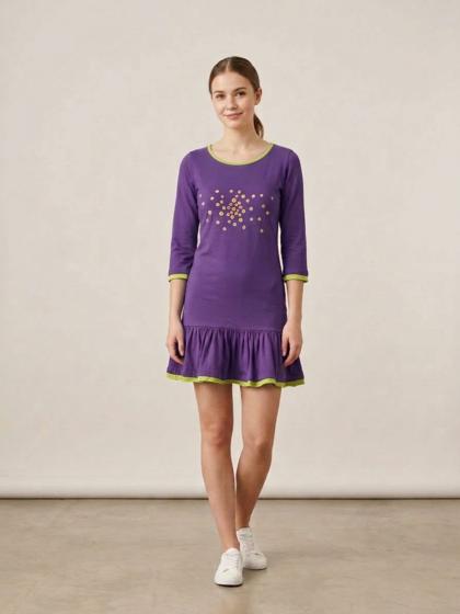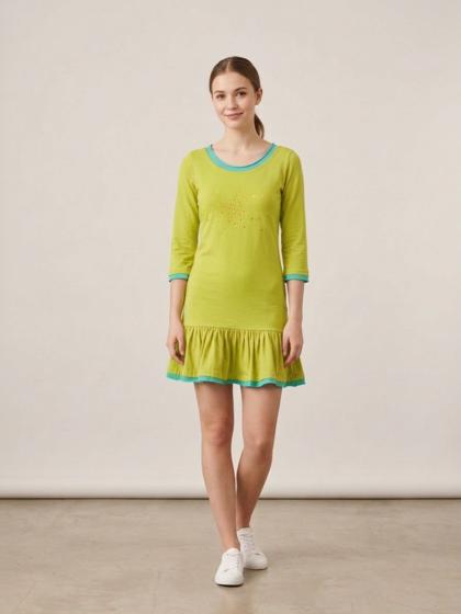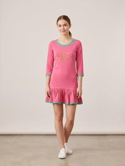 Long-sleeved dress with ruffles in Jersey with tulle perforations to make the garment very youthful and elegant at the same time.